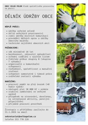 Obec Velká Polom vyhlašuje výběrové řízení na pozici pracovníka, jehož náplní bude údržba veřejné zeleně, úklid veřejných prostranství a zimní údržba místních komunikací. Bližší informace naleznete v přiloženém souboru.