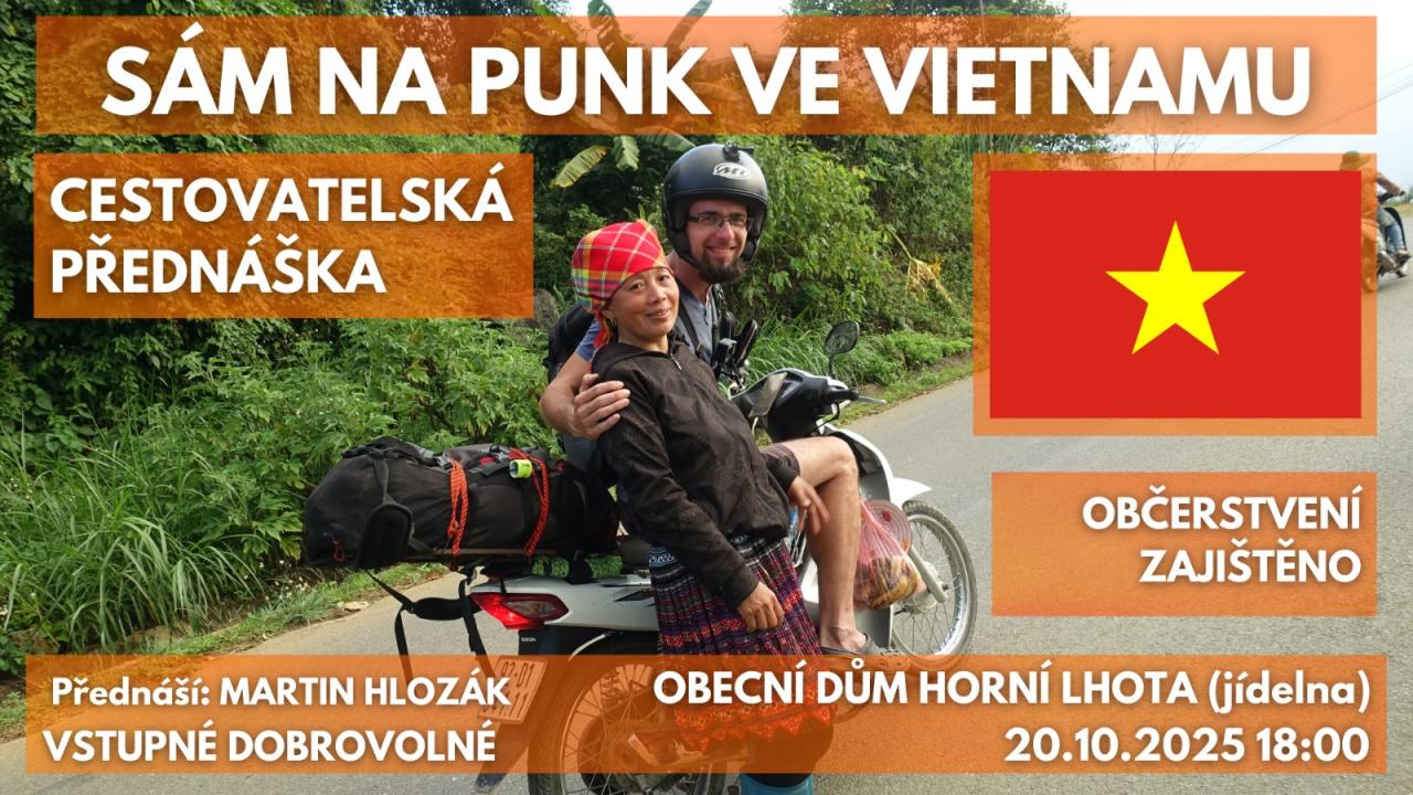 Obec Horní Lhota srdečně zve všechny občany na cestovatelskou přednášku hornolhotského rodáka Martina Hlozáka Sám na PUNK ve Vietnamu. Přednáška se uskuteční v prostorách zasedací místnosti obecního domu, v pondělí 20.10. od 18:00. Občerstvení zajištěno.