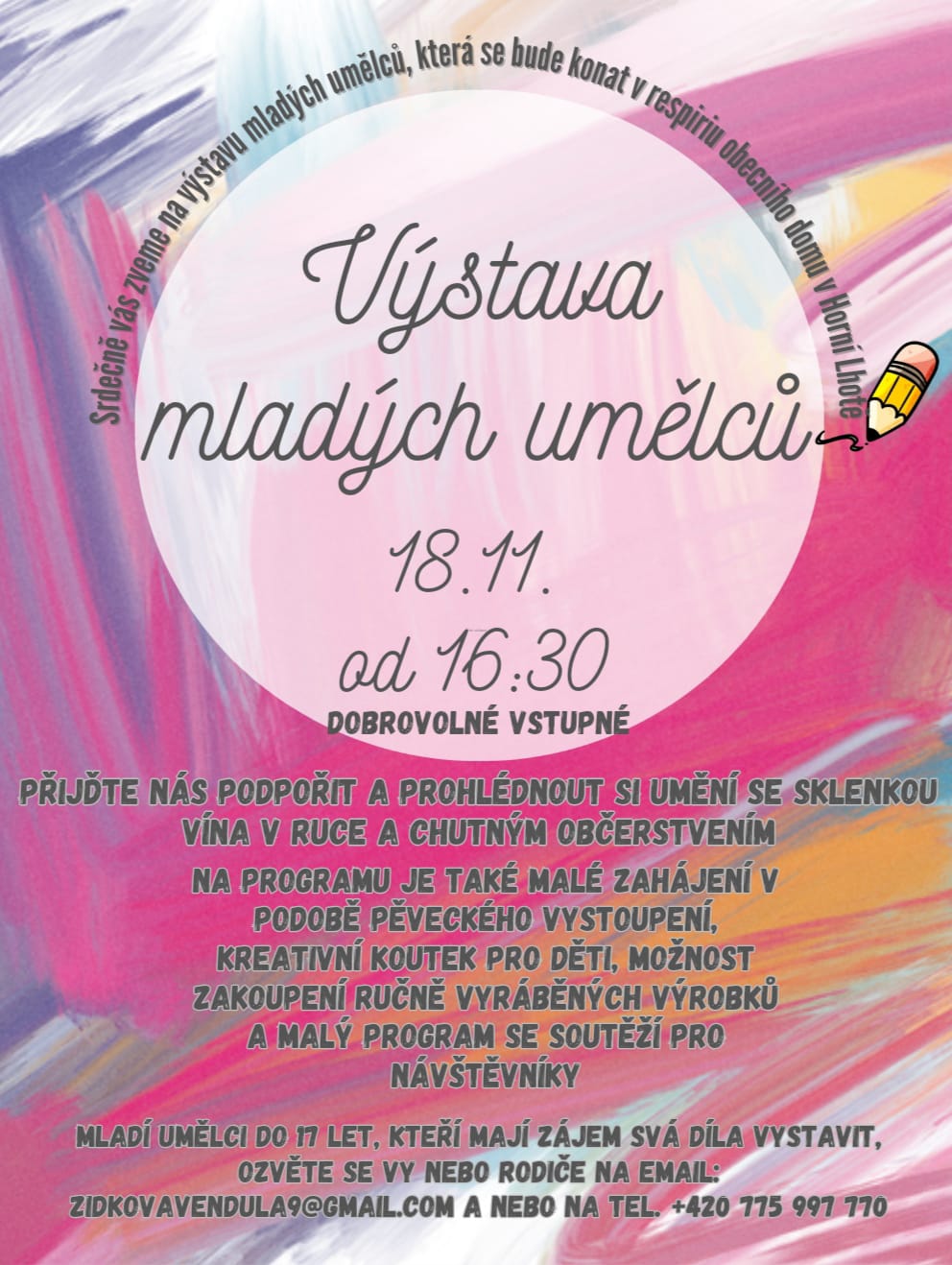Srdečně všechny zveme na výstavu mladých umělců 18.11. od 16:30 v respiriu Obecního domu. Pokud je vám méně než 18 let a chcete se účastnit jako autor, prosím kontaktujte Vendy Žídkovou na tel: 775 997 770 nebo na zidkovavendula9@gmail.com.